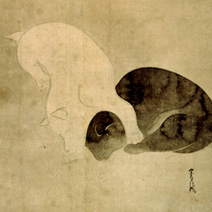 昔も今もかわいらしい動物は大変人気があります。日本美術にも動物がたくさん登場し、擬人化した姿で描かれた例も多くみられます。今回展覧会でご紹介しているのは琳派の犬。犬というと円山応挙や長沢芦雪を思い浮かべますが、琳派の画家たちもかわいらしい犬を描いています。たらし込みを活かして犬のフワフワした毛並みを表現した宗達。真正面を向いてお辞儀をするようなポーズのお茶目な芳中の犬。カタツムリを慈しむように見つめる雪佳の犬。それぞれの画家の犬への愛情をも感じられそうな作品となっています。ほのぼのとかわいらしい動物は時代を超えて人々を和ませてくれます。